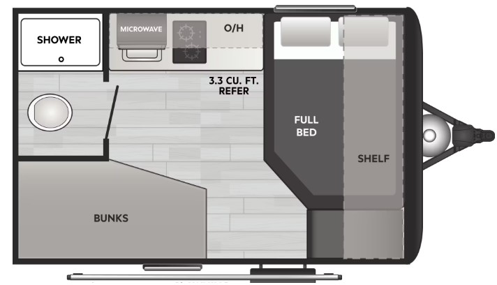 Storage: Features exterior pass-through storage and an interior shelf above the bed.