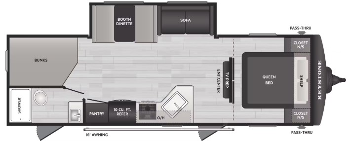 Exterior: Outside, the trailer has a durable aluminum exterior, a walkable roof, and an exterior pass-through storage compartment. For convenience, it includes a power tongue jack, heavy-duty stabilizer jacks, and is prepped for a backup camera.